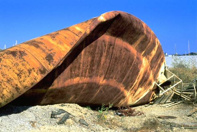 A collapsed fuel tank at an abandoned tank farm next to Richmond's pier 1. I like how it looks organic, like a snail shell.