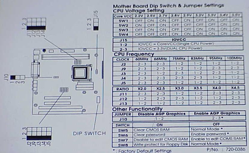In addition to changing the clocks, you also have to use the switches to change the core VCC - the K6 chips want voltages of 2.0V, 2.2V, or 2.4V, depending on which kind you have. If you have a choice, lower-voltage parts are preferable because they use less power and run cooler, but the 2.4V ones will definitely work. The eTower settings table doesn't have entries for 2.0V or 2.4V, but if you interpolate its missing entries you can figure out the proper settings.